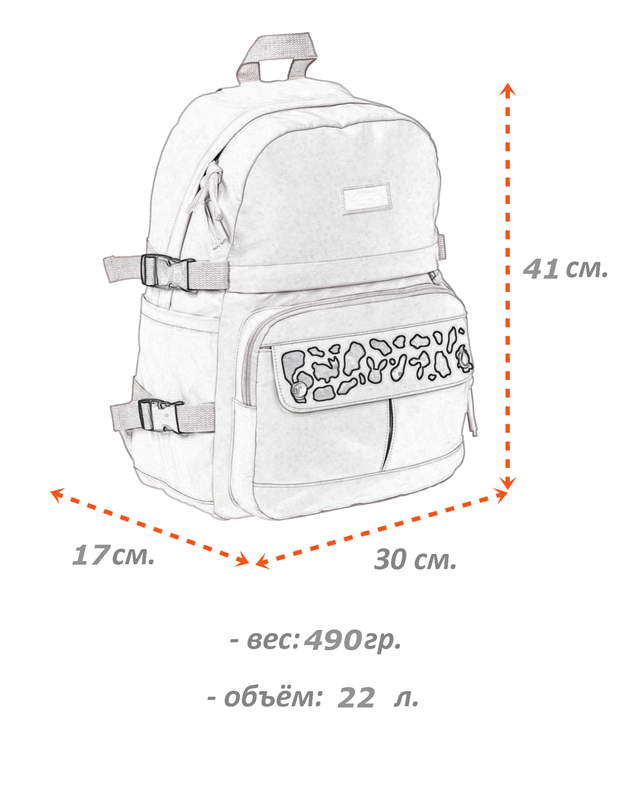 вес - 490 грамм; размер 41 х 30 х 17 см., объем 22 литра