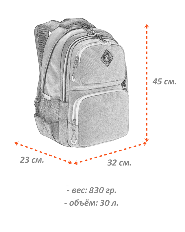 практичный и легкий рюкзак: вес - 830 грамм; размер 45 х 32 х 23 см., объем 30 литров