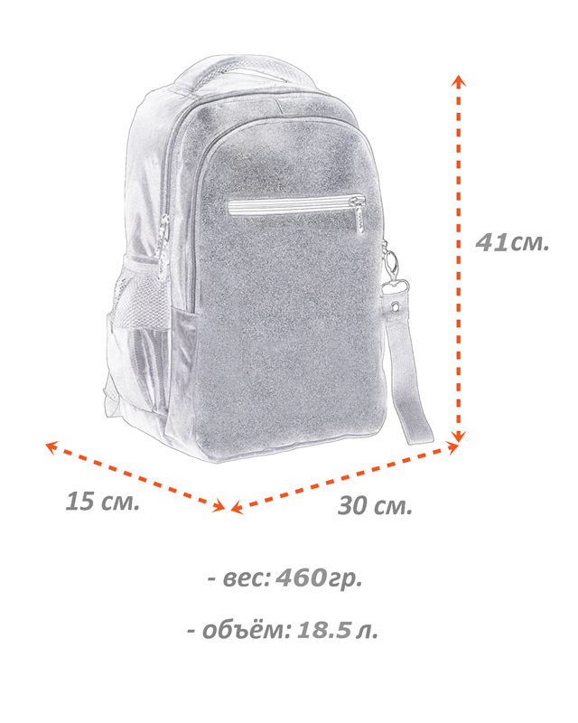 вес - 460 грамм; размер 41 х 30 х 15 см., объем 18 литр