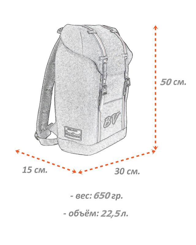вес - 650 грамм; размер 50 х 30 х 15 см., объем 23 литра