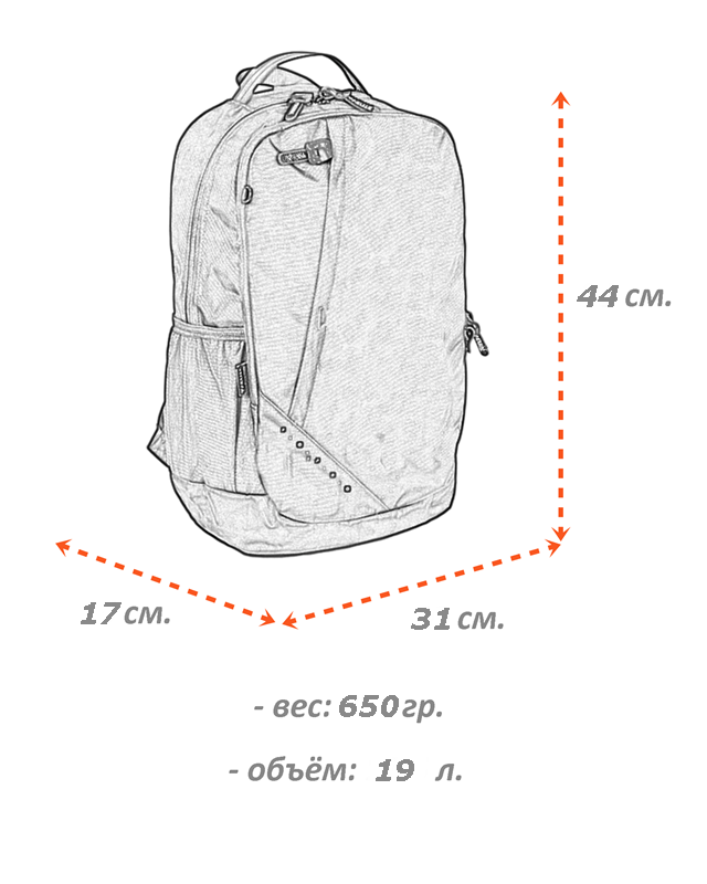 вес - 650 грамм; размер 44 х 31 х 17 см., объем 19 литров