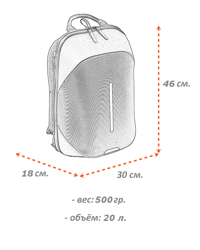 вес - 500 грамм; размер 46 х 30 х 18 см., объем 20 литров